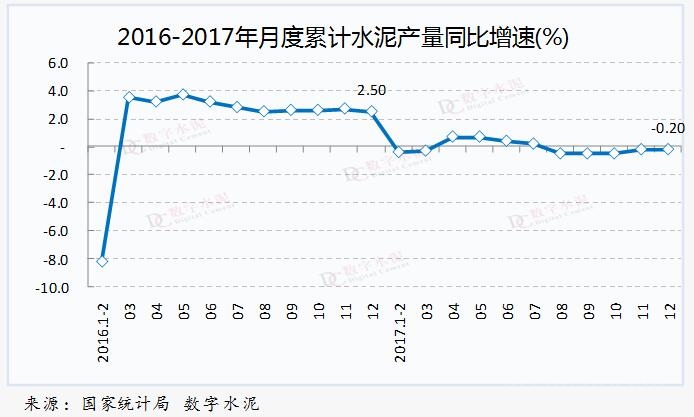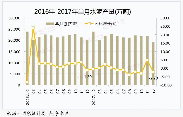 2017年,全国累计水泥产量23.2亿吨,同比下降0.2%,去年同期为增长2.5%。12月份,全国单月水泥产量1.9亿吨,环比大幅下降13.18%,同比下降2.2%。