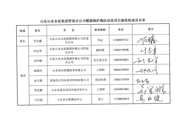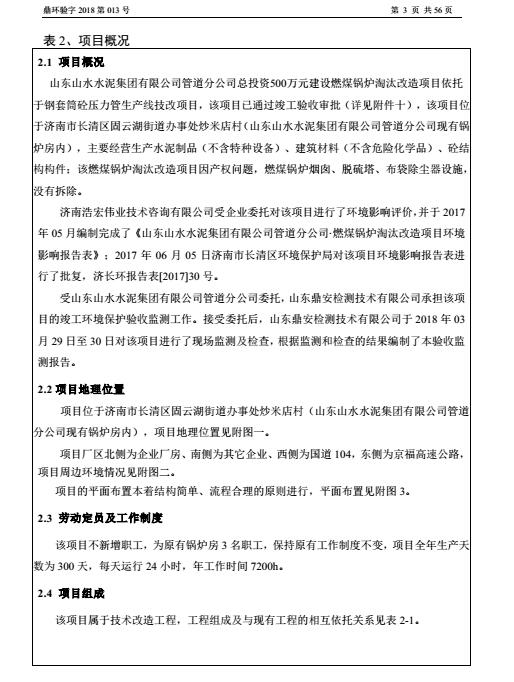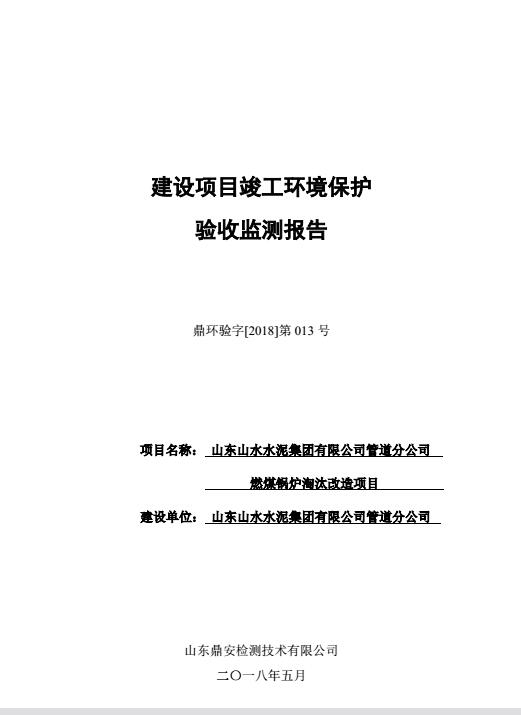 2018年5月22号,山东山水水泥集团有限公司管道分公司根据《山东山水水泥集团有限公司管道分公司燃煤锅炉淘汰改造项目竣工环境?;ぱ槭占嗖獗ǜ妗凡⒍哉铡督ㄉ柘钅靠⒐せ肪潮;ぱ槭赵菪邪旆ā罚细褚勒展矣泄胤煞ü?、建设项目竣工环境保护验收技术规范、本项目环境影响评价报告表和审批部门审批决定等要求对本项目进行验收。